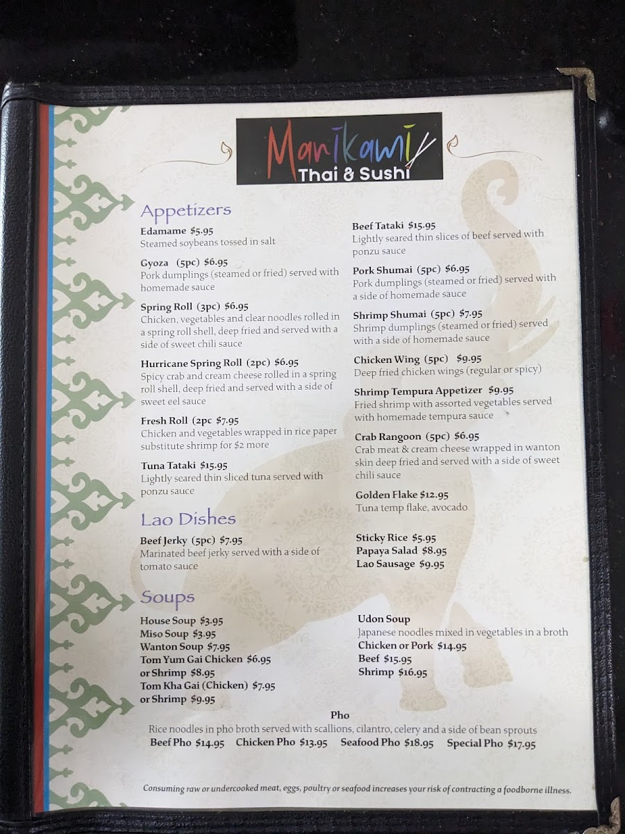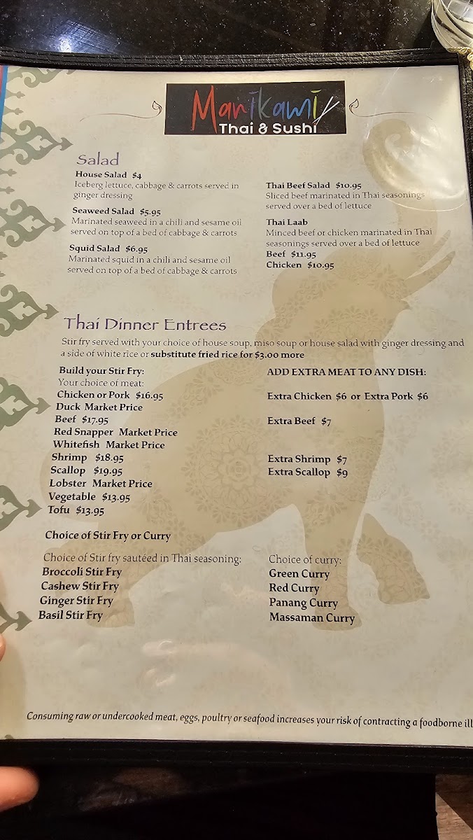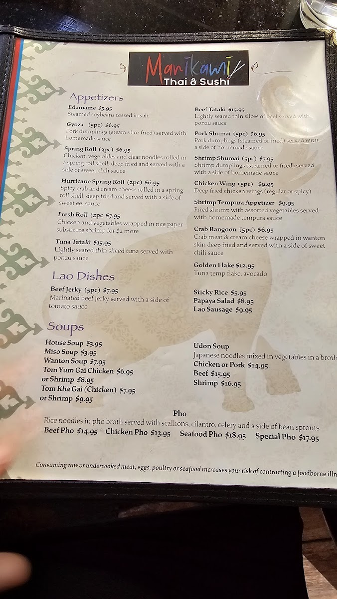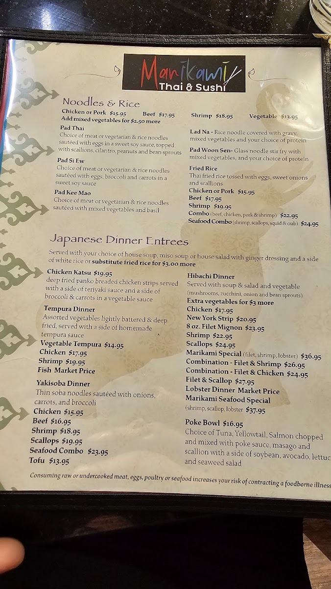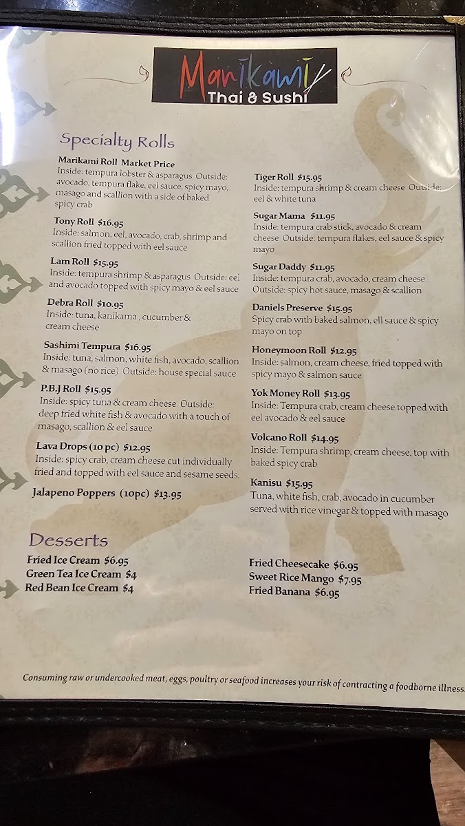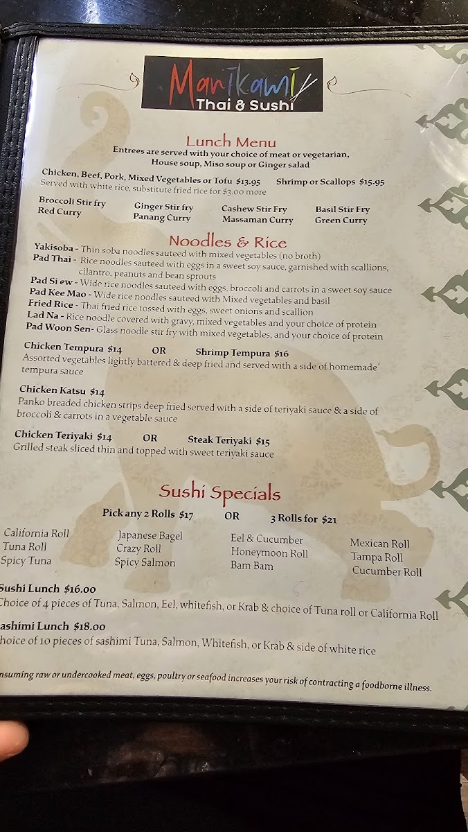 The menu at Marikami Thai & Sushi offers a blend of comforting Thai dishes and fresh sushi, presented in a straightforward and approachable style. Whether you're stopping by for a casual lunch or a relaxed dinner, the selection provides familiar favorites alongside unique combinations that reflect both cuisines.